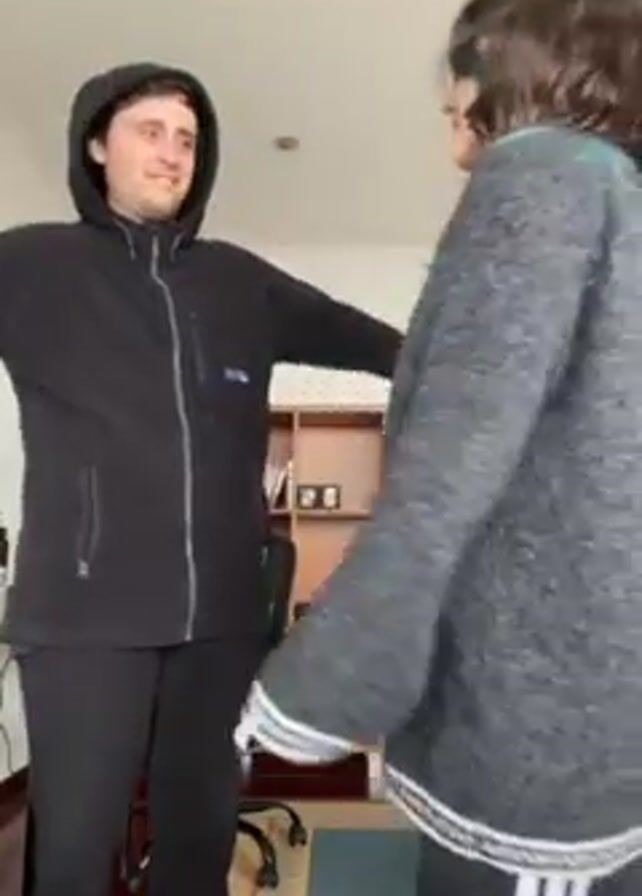 A video shows a man and woman standing in a room. The man is wearing a black hooded sweatshirt and black pants. The woman is wearing a gray sweater and black pants with white stripes. They embrace in a hug. The room has light-colored walls, a wooden door, and a rolling office chair.