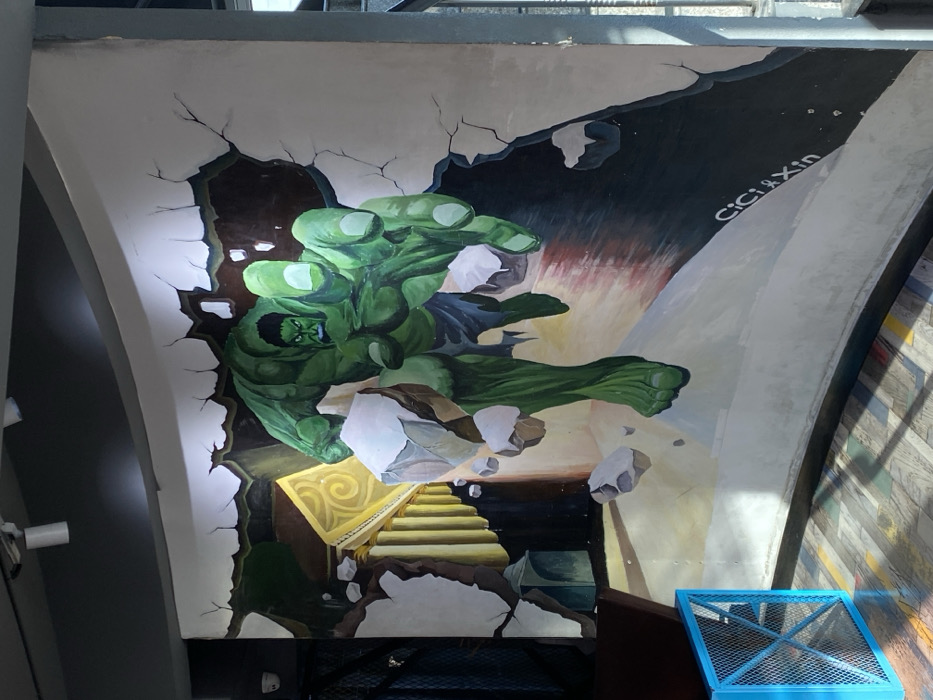 A vibrant mural depicts the Hulk bursting through a wall, his massive green hand reaching out. Cracks radiate from the impact point, with chunks of debris flying. Below the Hulk, a stylized staircase with golden accents leads upward. The artwork, titled "Cici&Xin," is painted on a curved architectural surface, suggesting a hallway or archway. A blue metal object is visible in the lower right corner.