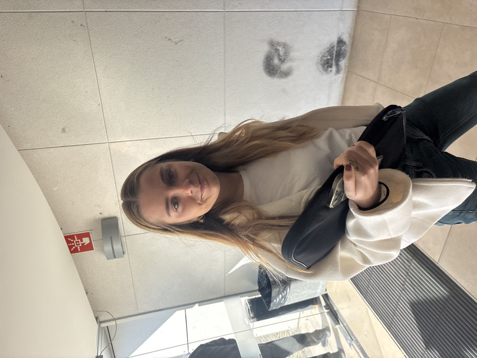 This image captures an indoor scene, located in the city of Porto Salvo, Portugal, featuring a young adult female subject and various environmental elements. **People:** The primary subject is a female with long, light brown hair, appearing to be in her twenties, positioned centrally and looking directly at the camera with a slight smile. She wears a white crew-neck t-shirt, an open cream or light beige fleece jacket, and dark blue jeans. Small gold-colored hoop earrings are visible. Her left hand is holding a black rectangular zippered case or bag, and a smartphone with a clear case is resting atop it. A ring is visible on her left ring finger. In the background, to the far left, a partial reflection of another individual in dark clothing and shoes is visible in a glass surface. **Objects and Environment:** The scene is set in what appears to be a well-lit hallway or entrance area of a building. The walls are composed of light-colored, possibly beige or off-white, square tiles with visible grout lines. On the wall above the primary subject's head, to the left, a red emergency pull station sign with white pictograms (an arrow pointing to a hand and vertical lines, with text "1982-1983") is mounted. Below this sign, a grey, curved wall-mounted light fixture is present. The right wall displays several dark, irregular smudges or marks, particularly two prominent ones on the lower section. The floor is covered with light-colored, possibly beige, square tiles. To the left, a glass door or partition is visible, reflecting sunlight and the partial figure of another person. A dark, cylindrical trash bin with a liner is visible through this glass. A rectangular metal grate is integrated into the floor near the base of the glass partition.