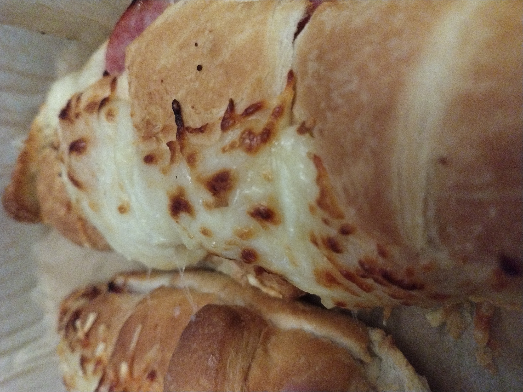 The image displays a close-up, slightly angled view of multiple savory baked pastries, resembling ham and cheese croissants or similar rolls, contained within a light-colored, possibly paper or parchment-lined, tray or container. This scene is located in Crauthem, Luxembourg. The pastries possess a golden-brown, flaky crust. Each is covered with a substantial layer of melted white cheese, which exhibits areas of golden-brown caramelization and bubbling, indicating it has been recently baked or heated. Portions of pinkish cured meat, consistent with ham, are visible beneath the cheese and within the pastry structure, particularly on the item positioned to the right. The items are arranged in parallel, partially overlapping, and fill the majority of the frame. No individuals are present, and no actions or interactions are depicted. The lighting is diffused, suggesting an indoor environment.