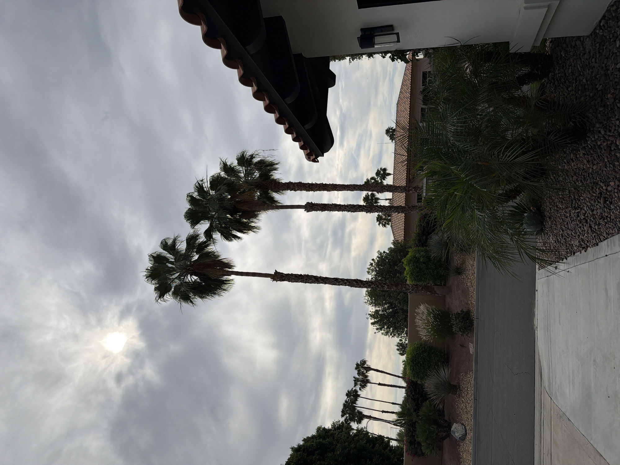 This photograph, taken in La Quinta, United States of America, presents a view from underneath the eaves of a building, likely a house, oriented towards a street lined with palm trees. The sky is predominantly overcast, with the sun visible as a bright spot obscured by clouds. The palm trees appear to be a dominant feature of the landscape, extending along the road. The angle of the shot and the proximity to the building suggest the photograph was taken from a residential area or possibly from within a property bordering the street. The ground surface is a mixture of paved road, sidewalk, and landscaped areas containing rocks and foliage. The overall setting implies a typical residential environment within the city of La Quinta, known for its palm-lined streets and desert landscape. There are no people visible in the image.