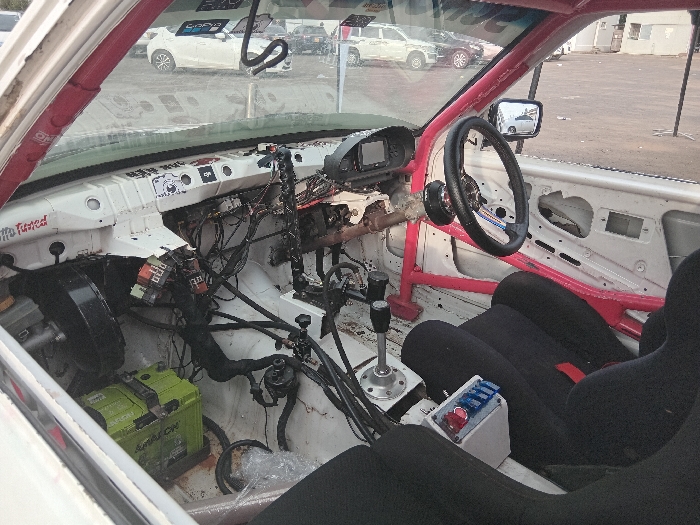 The image displays the interior of a heavily modified, stripped-down white vehicle, identified as a rally or race car, viewed from the passenger side looking forward through the windshield