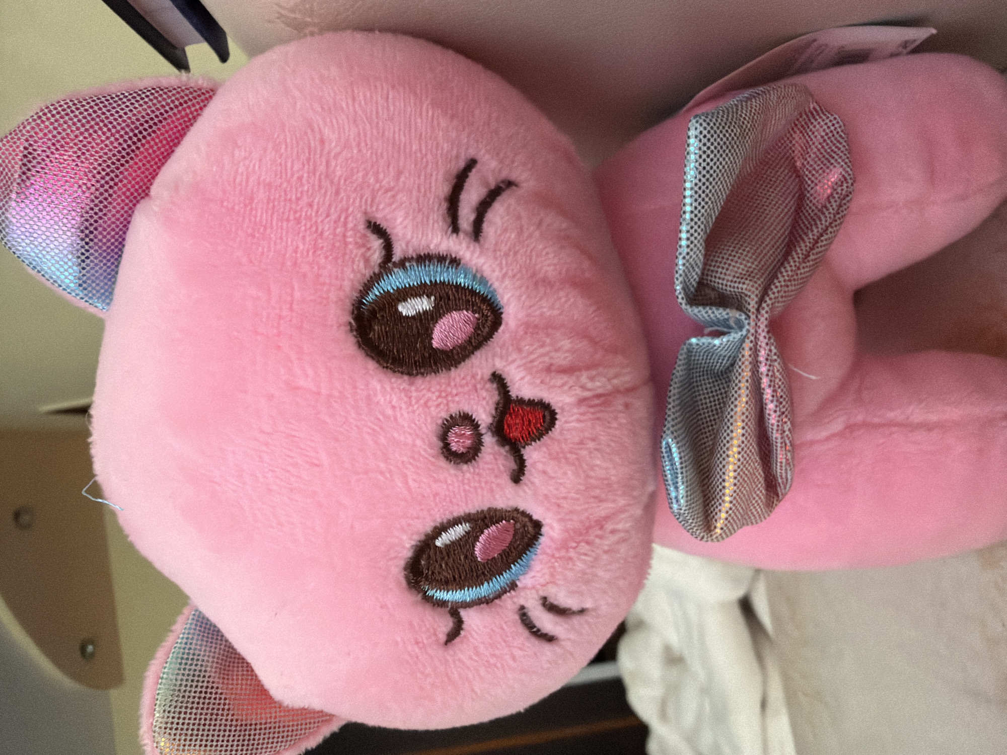 A close-up, indoor shot depicts a pink stuffed toy bunny lying on its side. The bunny has a rounded head and body, embroidered eyes, nose, and mouth, and ears made of iridescent fabric. A bow made of the same iridescent fabric is attached to the side of the bunny. The background is blurred and shows white fabric. The location is not evident.