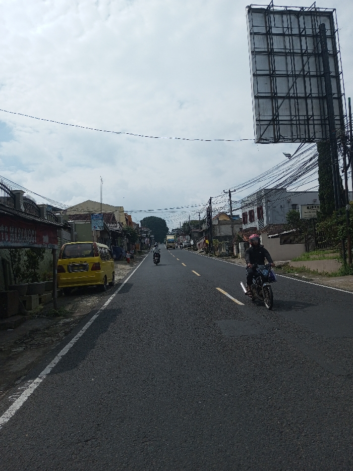 A straight asphalt road stretches into the distance, flanked by buildings and greenery. A yellow van is parked on the left side of the road. Two motorcyclists are visible, one closer and one further away. Overhead, a network of wires crisscrosses the sky beneath a partly cloudy sky. A large billboard stands on the right, partially obscuring the view. The scene depicts a typical street view in an urban or suburban setting.