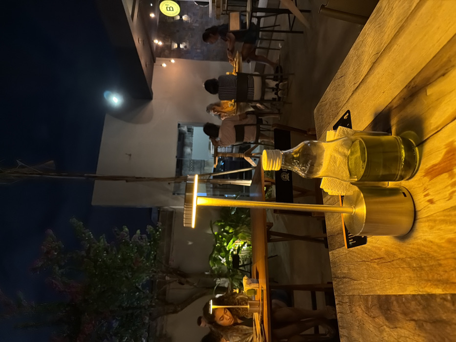 An outdoor dining area at night, featuring wooden tables and chairs. People are seated at some tables, enjoying meals. A silver lamp and a bottle of oil sit on one of the tables in the foreground. In the background, there's a building with a visible logo on the facade. Some greenery is visible outside, partially lit by artificial lights. The night sky is a dark blue, contrasting with the warm light illuminating the dining space.