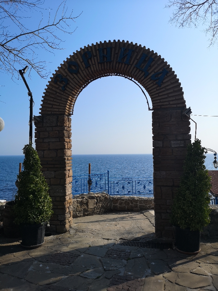 The image displays an outdoor scene featuring a stone and brick archway framing a view of the Black Sea in Nesebar, Bulgaria