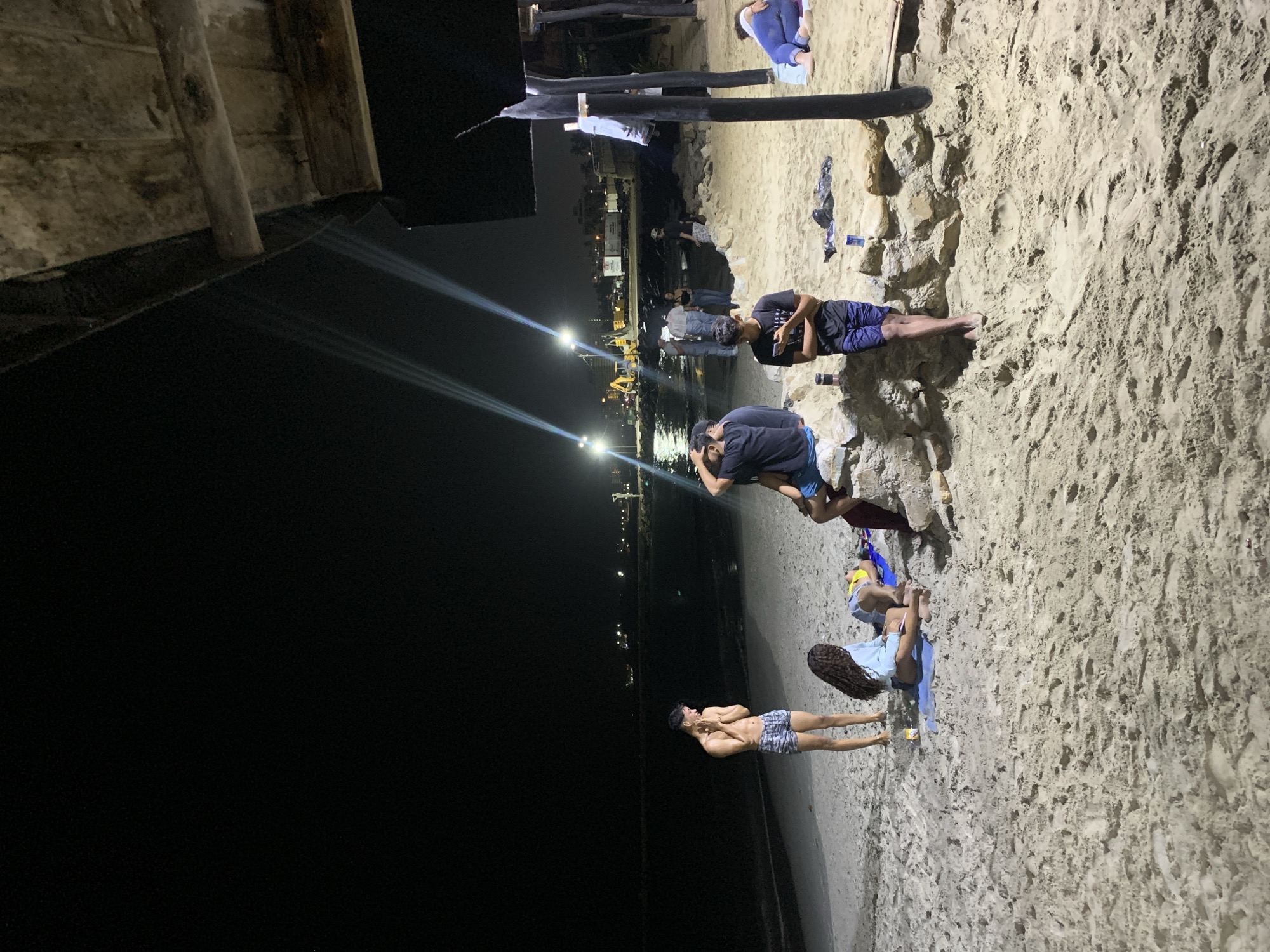 group of people gathered on a beach at night. The location is Pampatar, Venezuela, as suggested by the presence of streetlights in the background, indicating a coastal city. The beach is sandy and stretches from the foreground to the water's edge. The group of people appears to be casually interacting, with some sitting or lying on the sand, while others are standing. Individuals are dressed in casual clothing and swimwear. The beach is illuminated by overhead streetlights, visible along the coastline. There is some kind of structure or architectural feature visible on the left of the image.