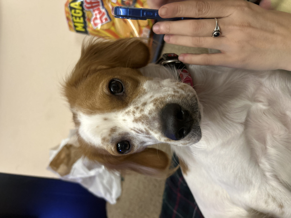 The image displays an indoor close-up focused on a dog and a human hand. The primary subject is a medium-sized dog with a white coat marked by extensive brown and tan patches, particularly on its head and long, floppy ears. Its large, dark eyes are fixed directly on the viewer, and its nose is dark. A patterned collar, appearing pink or red with white elements, encircles its neck. A crumpled white tissue or piece of paper is visibly caught on or draped over the dog's left ear (viewer's right). In the lower right quadrant, a human hand is present, holding a blue-cased smartphone vertically. The hand has a slender appearance, and a silver-colored ring with a dark, round stone is worn on the ring finger. To the right and slightly behind the dog's head, a large, upright bag of "MEGA Ruffles" potato chips, primarily yellow and red, is visible. The dog is positioned on a surface covered by a plaid fabric featuring green, blue, and red patterns. The background to the left shows a dark blue object, likely part of furniture or electronics, against a plain light beige wall. The specific city location of Sofia, Bulgaria, cannot be identified from the visual cues within this image.