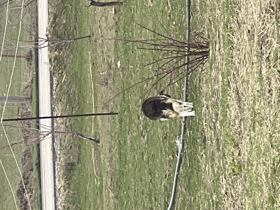 A medium-sized dog with a mottled brown and white coat is lying down in a grassy field. The dog is positioned near a thin, dark pipe running across the landscape. A small, leafless bush is in the background near the dog. A road or path with a white surface is on the left side of the image. Bare branches and metal supports run parallel to the path. The overall tone is natural and rural.