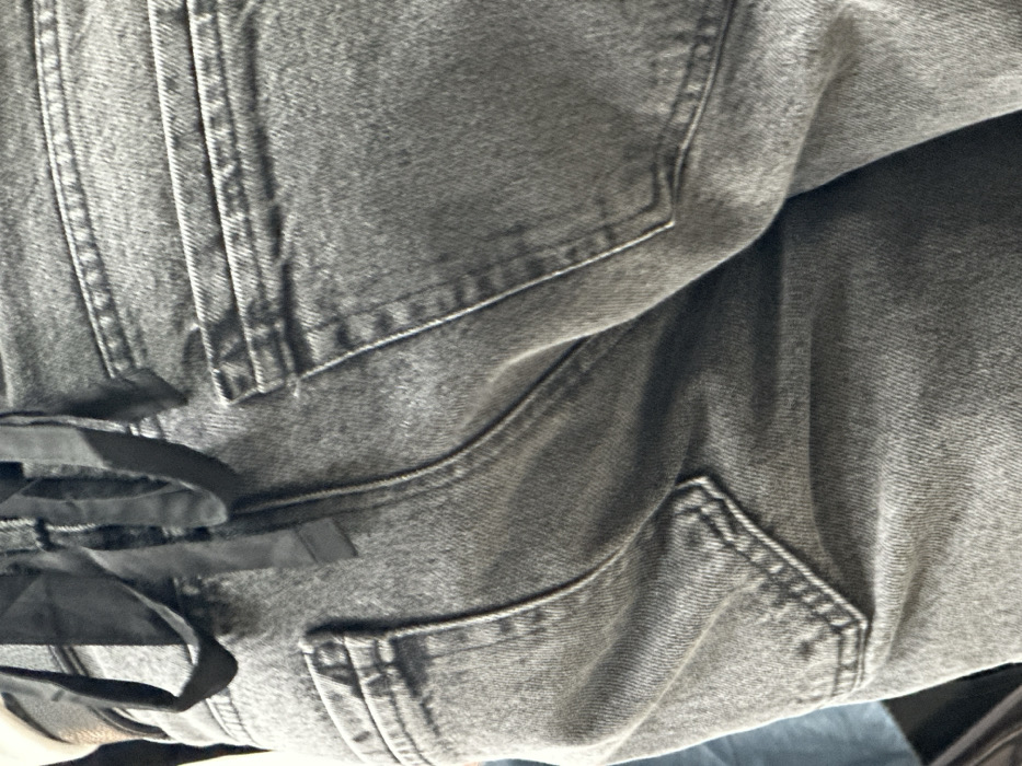 The image displays a close-up, angled view of the lower back and upper legs of an individual from behind, located in Stara Zagora, Bulgaria. The subject is wearing a pair of faded grey denim jeans. A black fabric tie or ribbon is visible at the waistband, looped and extending downwards. The jeans feature prominent stitching around the rear pockets; the left rear pocket is partially visible, while the right rear pocket is fully visible with horizontal stitching across its top edge and vertical stitching along its sides. The denim fabric shows minor creasing consistent with wear. The background is out of focus and appears as indistinct blurred shapes, including a light blue area on the left and darker tones elsewhere, providing no further environmental details or indicating any specific action or interaction. No other individuals or objects are discernible in the immediate vicinity.