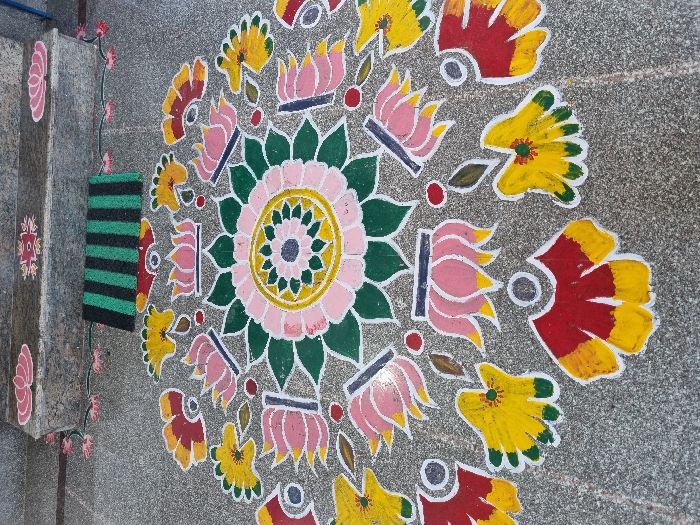 - "The image displays a vibrant, multi-colored Rangoli design meticulously executed on a light gray, speckled stone surface in Koyalaguttapalli, India" by FM-Qmj6l1, licensed under CC BY 4.0