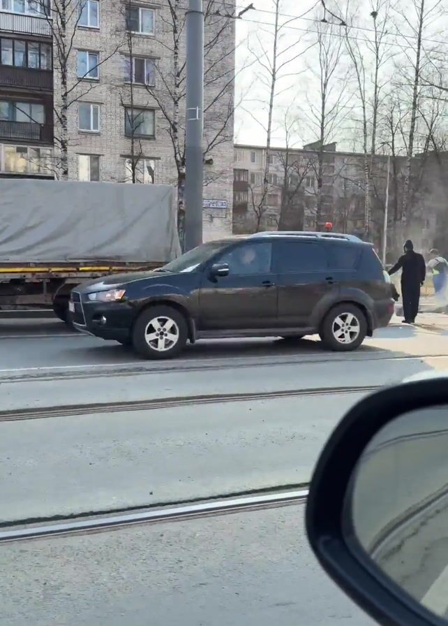 vehicle moving along a road, passing a white truck with a covered bed and a flatbed trailer. A small orange utility vehicle with two workers operating it is visible on the side of the road. One worker in a dark coat and another in protective gear are next to the utility vehicle. The setting appears to be an urban environment with buildings and trees lining the road. Tram tracks are visible on the road surface.