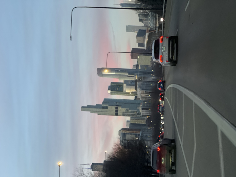A cityscape with tall buildings illuminated against a twilight sky with streaks of pink. Several cars are traveling on a highway, their red taillights glowing. Streetlights line the road. Some trees are visible on the left side of the image.