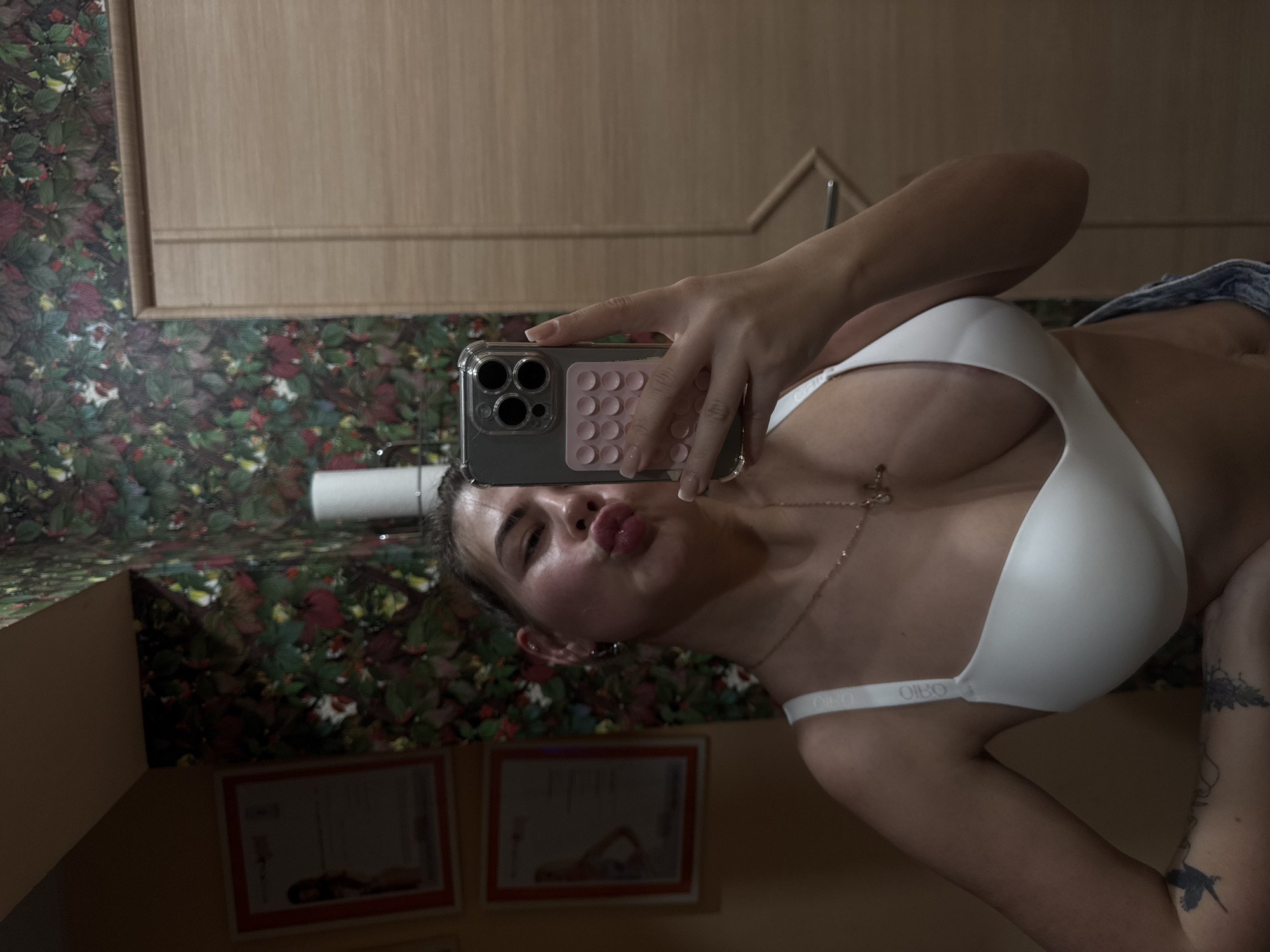 A woman is taking a selfie in a room with floral wallpaper and wooden paneling. She is wearing a white bra and holding a cell phone with a clear case and a pink, textured grip. The room also has two framed pictures on the wall. The location is Chaikovsky, Russia.