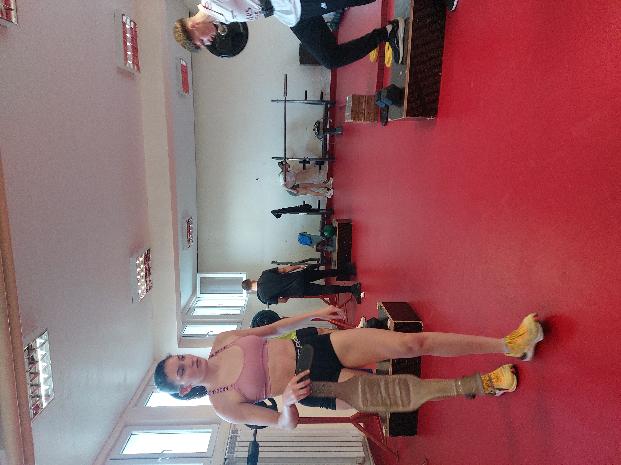 The image captures a gymnasium or fitness center with a predominantly red floor. A young woman wearing a pink sports bra with white lettering and black shorts is prominently featured in the foreground. She is holding a weightlifting belt. She is wearing yellow sneakers. In the background, several other individuals are engaged in various exercises. One man is positioned near weightlifting equipment, and another is standing on a raised platform with weights. The setting appears to be indoors, with windows visible along one wall. The lighting is artificial, provided by ceiling fixtures. The details of the location within the city of Vratsa, Bulgaria, cannot be determined from the image.