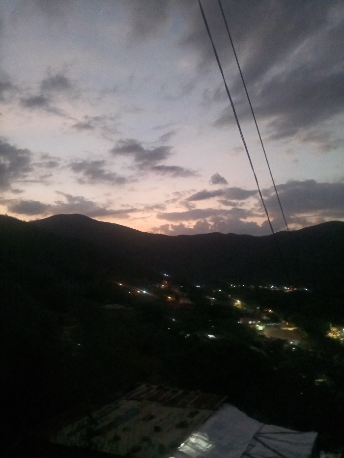 A dusky scene presents a silhouette of mountains against a sky painted with shades of gray and faint pink. Light scatters across the darkened landscape below, dotted with tiny clusters that suggest a small village. A pair of power lines traverse the upper right of the frame, drawing the eye upwards. In the foreground, a roof is visible, adding depth to the vista. The overall tone is peaceful, capturing the transition from day to night.