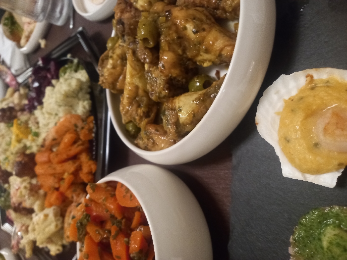 A culinary display features a variety of dishes. A white bowl overflows with cooked chicken, garnished with green olives. Another white bowl holds glazed carrots with herbs. Adjacent to the bowls, a scallop shell cradles a yellow, creamy seafood dish. A platter showcases an array of salads, including potato, carrot, and couscous salad. Each dish presents a different texture and flavor.
