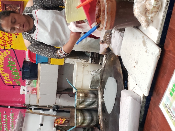 A woman wearing an apron prepares food at a brightly colored street food stall. She holds a container with a blue utensil in it, seemingly adding ingredients. A hot griddle displays a white tortilla, while stacks of cans sit nearby. Behind her, a pink wall features handwritten text, and various containers and ingredients are visible. The scene captures a street food cooking moment.
