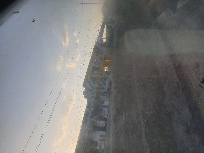 An outdoor shot depicts buildings under a cloudy sky, viewed from behind a dirty glass surface. Power lines are visible against the sky. The right side of the image is dominated by the obscured glass, which reduces clarity and distorts the distant scene. The building facades display a variety of colors and details. The composition emphasizes the separation between the viewer and the external environment.