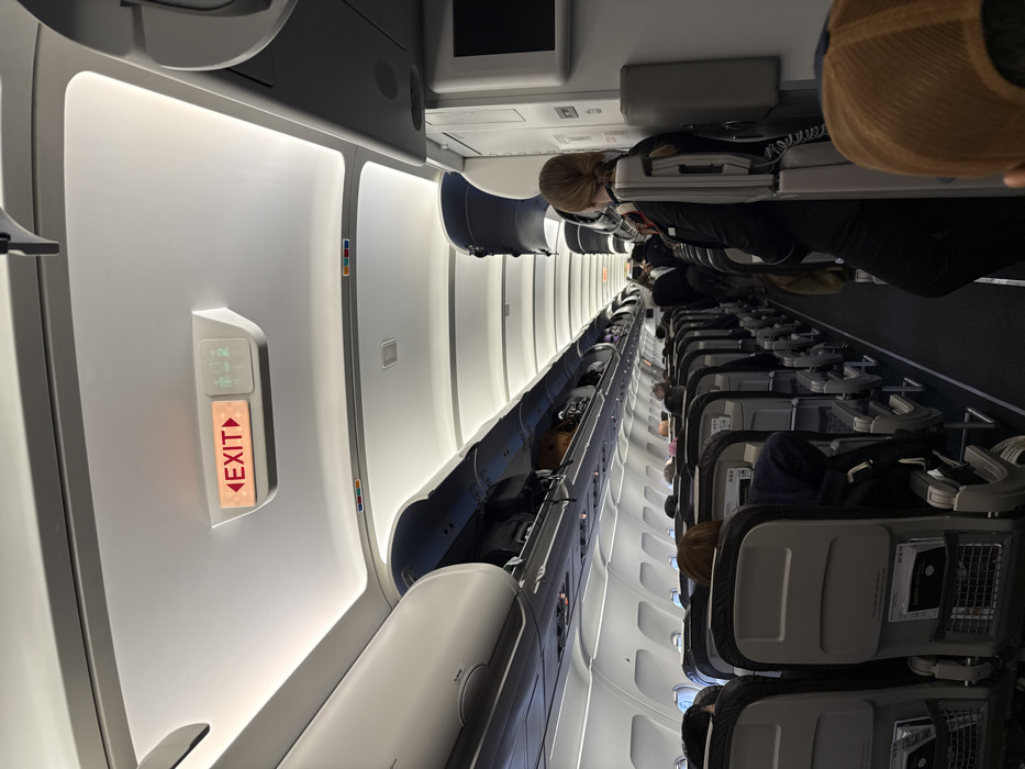 - "The image depicts the interior of a commercial aircraft cabin, observed from a passenger's perspective, likely at Paris Charles de Gaulle Airport (CDG) in Roissy-en-France, France" by FM-oqpKo1, licensed under CC BY 4.0