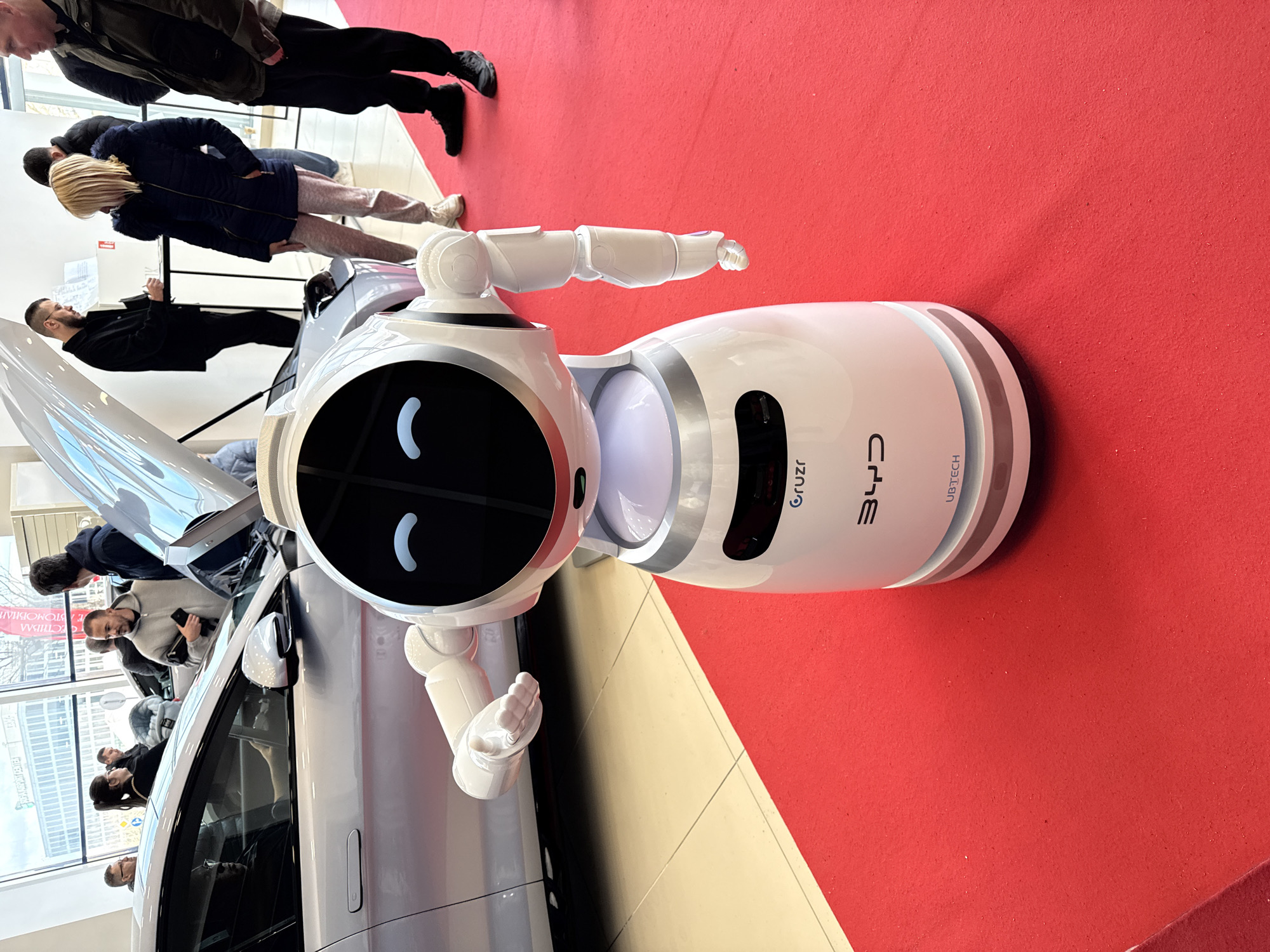 The scene depicts an indoor exhibition or showroom in Sofia, Bulgaria. A white and silver anthropomorphic robot, labeled "Cruzer" and "BYD UBTECH," stands on a red carpet in the foreground. The robot possesses a circular black screen for a head, displaying a blue, crescent-shaped smiling face, and articulated arms. Its right arm is extended forward with an open palm, while its left arm is bent at the elbow. Behind the robot, a silver sedan is prominently displayed with its hood open. Several individuals are present in the background, interacting with the vehicles. One man in a dark jacket leans into the open hood of the silver car, while another man in a light grey hoodie stands nearby, holding a dark object. A woman with blonde hair, dressed in a dark blue puffer jacket and light pink sweatpants, observes the car's engine bay. Additional people are visible further back, including an individual seated in the driver's seat of the silver car and others congregating around another partially visible vehicle. The floor consists of a red carpet in the immediate foreground, transitioning to light-colored tiled flooring towards the back. Large windows form the rear wall of the venue, offering a view of an urban landscape with multi-story buildings. A banner is partially visible outside the windows, displaying Bulgarian text including "ГРАДСКИ ТРАНСПОРТ" (City Transport) and phrases indicative of an automotive or industrial event. The interior is brightly illuminated by overhead lighting.