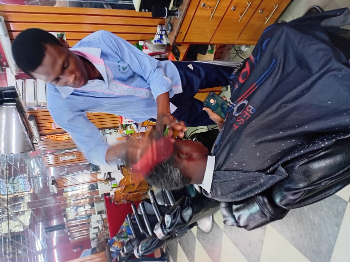 Inside a barbershop in Dorayi, Nigeria, an adult male barber with dark skin and short dark hair is attending to a seated client