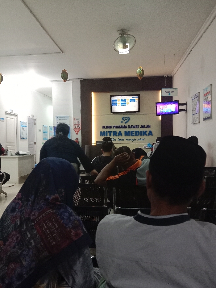 interior of a clinic waiting room in Kecamatan Kaliwungu Selatan, Indonesia. There are six people, five of them sitting, waiting. They are all facing the front, towards the reception desk and entrance to the office. Two people are wearing a hijab or headscarf. Two are wearing dark clothing, two are wearing light clothing, and one is wearing a bright orange and black shirt. The clinic is named "Klinik Pratama Rawat Jalan Mitra Medika". There is a monitor displaying a schedule or menu on the wall behind the reception desk. The ceiling is white with a ceiling fan. The walls are painted white. There is a door on the left side of the room, and a desk with a chair in front of it. The waiting area is furnished with black metal chairs. There is a second, smaller, TV monitor near the ceiling. The wall is decorated with framed posters. The floor is clean. The room is bright and well-lit.