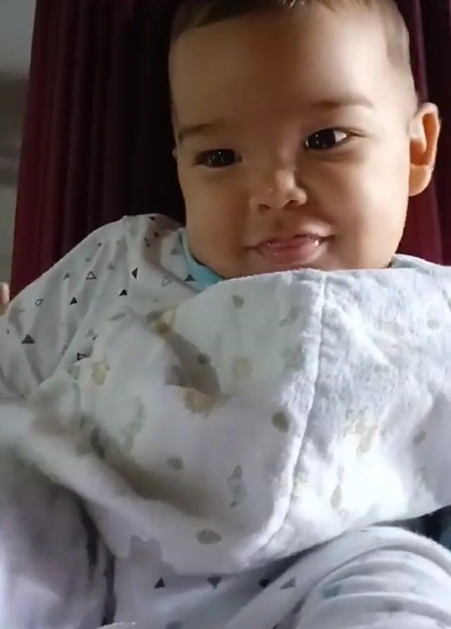A baby wearing a white onesie sits in a hammock. The baby is facing the camera and looks around. The baby has dark hair and brown eyes. A burgundy curtain is in the background.