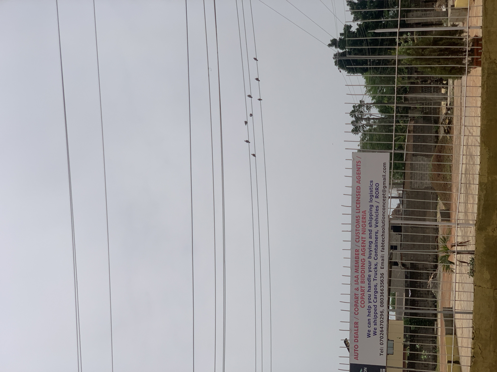 view in Ikorodu, Nigeria. Seven birds are perched on a series of power lines against a grey sky. A metal fence runs horizontally across the lower half of the image, obscuring a view of trees and a building in the background. An advertisement for a car dealer and customs agent is attached to the fence. The ad lists the business as an "AUTO DEALER / COPART & IAA MEMBER / CUSTOMS LICENSED AGENTS / COPART BIDDING AGENT NIGERIA" and provides contact information including phone numbers and an email address.