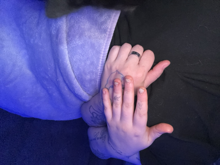 Two hands, one larger than the other, are placed together on a dark surface. The larger hand has a ring on the ring finger and a small tattoo on the wrist. The smaller hand has glitter nail polish and a tiny tattoo on the finger and wrist. They rest against a light blue fuzzy blanket, with dark clothing nearby. The lighting is dim.