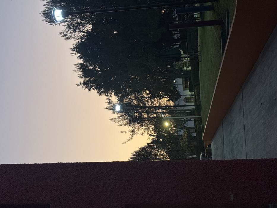 A dusk scene shows the sky transitioning from light to dark above trees with sparse leaves. Streetlights illuminate the area. A building can be seen in the background, past a green lawn. A textured, dark red wall is in the foreground on the left. On the right, a gray wall with an orange border runs vertically.