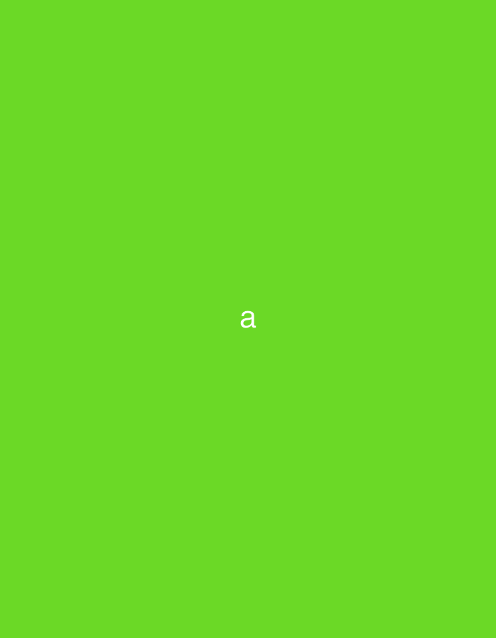 A bright green background fills the frame. Centered vertically and horizontally, the lowercase letter "a" appears in a simple, sans-serif font. The "a" is white, contrasting starkly against the vibrant green backdrop. The overall composition is minimalist, focusing solely on the single letter and its relationship to the color field.