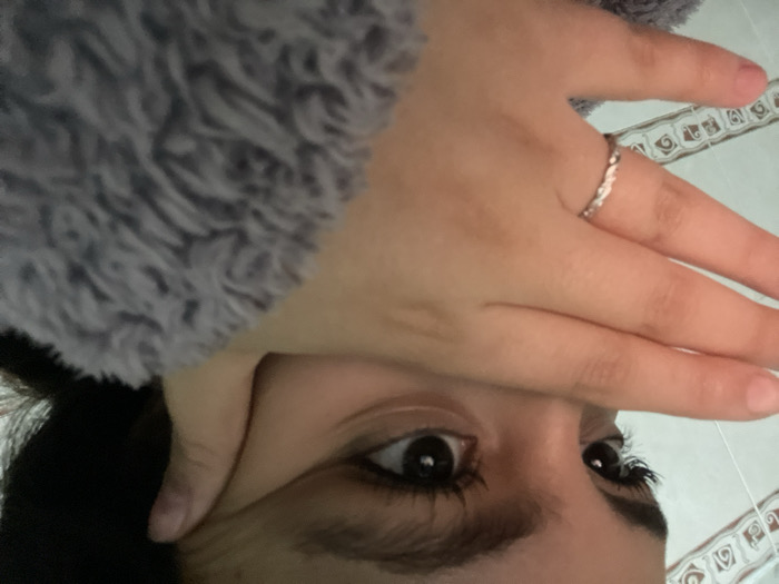 A person is covering their face with a hand wearing a ring. The individual has dark hair, dark eyes, and long eyelashes. A grey, textured fabric is visible. The background shows a tiled surface with a decorative pattern.