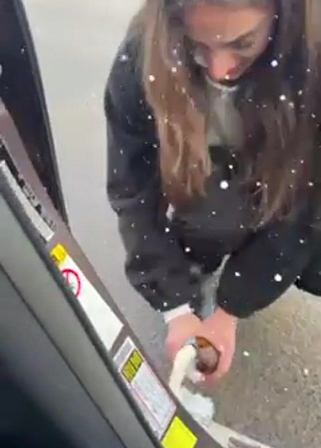 A young woman opens a bottle of champagne against a car door frame. She is wearing a black jacket, a white top, and black pants. The surrounding environment includes snow-covered ground and a road, suggesting a cold or mountainous location. The champagne bottle is brown, and the liquid is effervescent. When opened, champagne spills out, and the bottle cap flies into the car. The woman is smiling and seems excited.