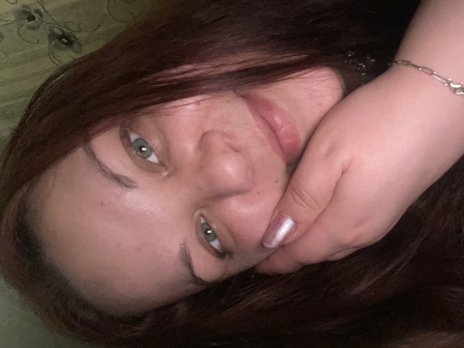 A close-up portrait displays an adult female with reddish-brown hair and light green eyes, looking directly at the camera with a subtle smile