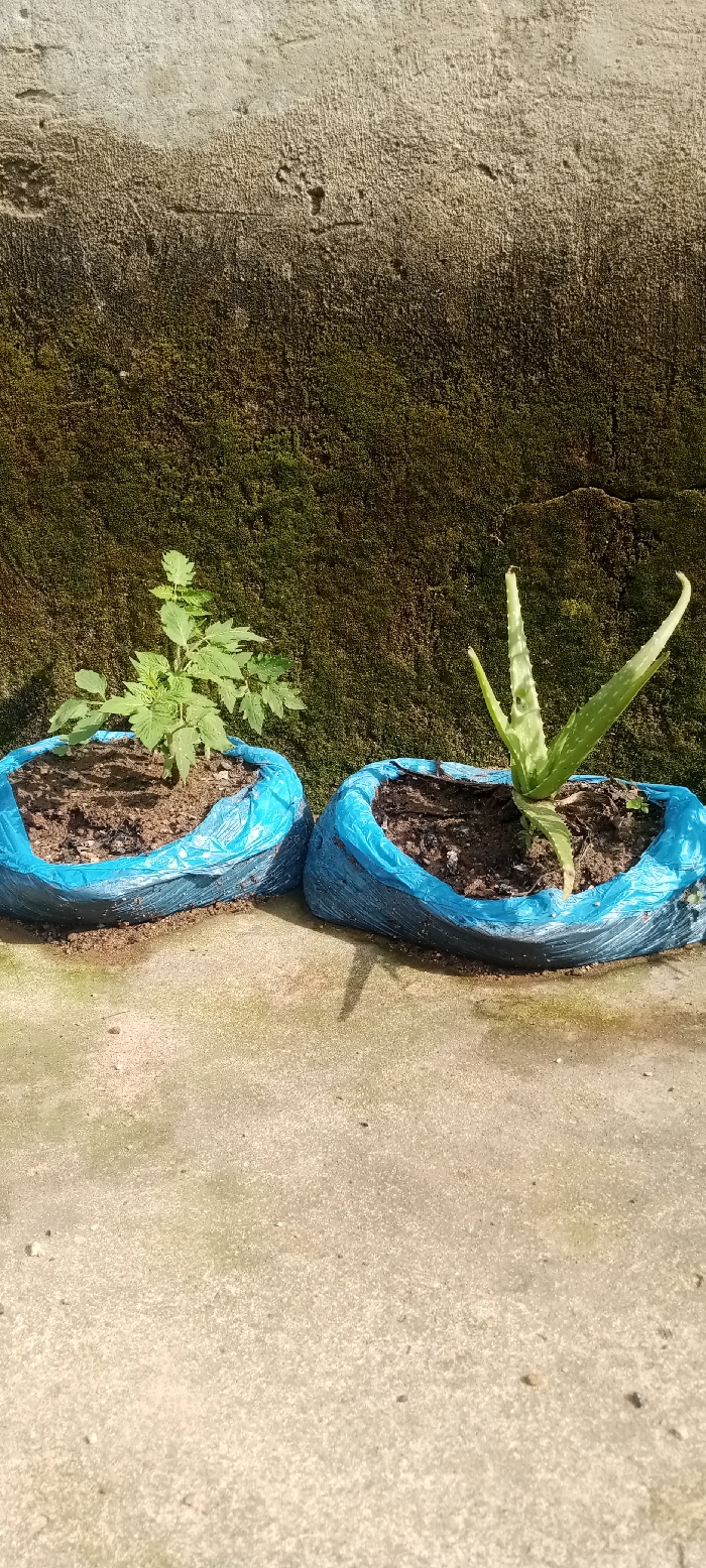 The image depicts an outdoor scene in Kwamba, Nigeria. Two improvised planters, fashioned from blue plastic bags, are positioned side-by-side on a light-colored, possibly concrete, ground surface. Both planters are filled with dark soil. The planter on the left contains a small, multi-leafed green plant, consistent with a young vegetable or herb plant. The planter on the right holds an Aloe Vera plant, distinguished by its thick, pale green, succulent leaves. Strong sunlight from the right casts distinct shadows from the planters onto the ground. A textured concrete wall forms the background, heavily covered with dark green moss or algae, especially in its lower and middle sections, transitioning to a lighter grey at the top. No individuals, actions, or interactions are visible.