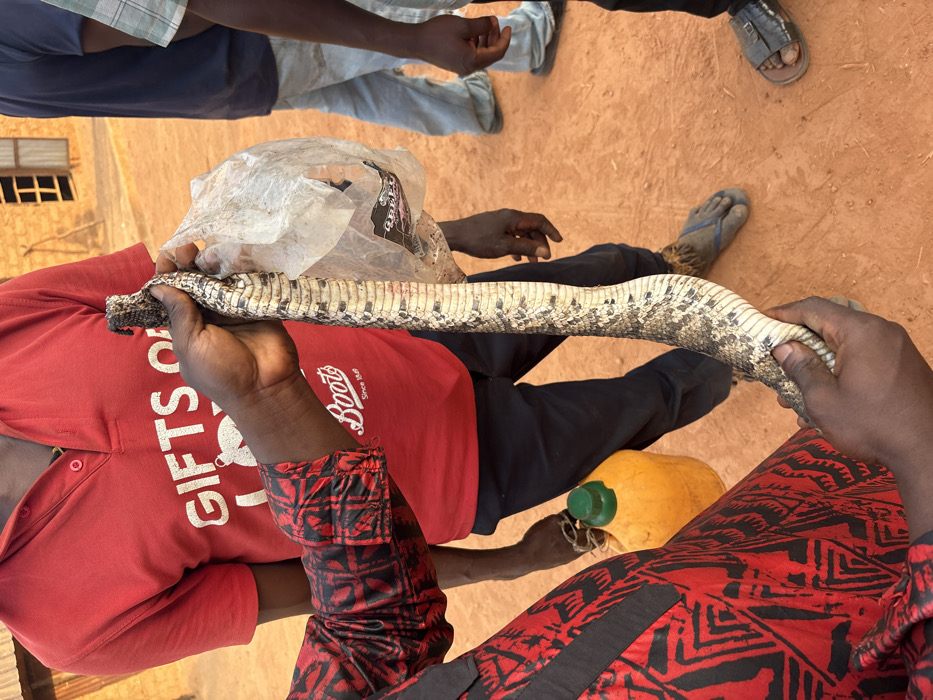 Several people stand on reddish-brown dirt. One person, wearing a red t-shirt, holds a large snake with white and grey patterns. Another person in a red and black patterned shirt assists, while a yellow container rests nearby. Additional individuals stand in the background, some wearing sandals or casual shoes. A plastic bag is visible close to the snake. A building with a window is seen in the background.