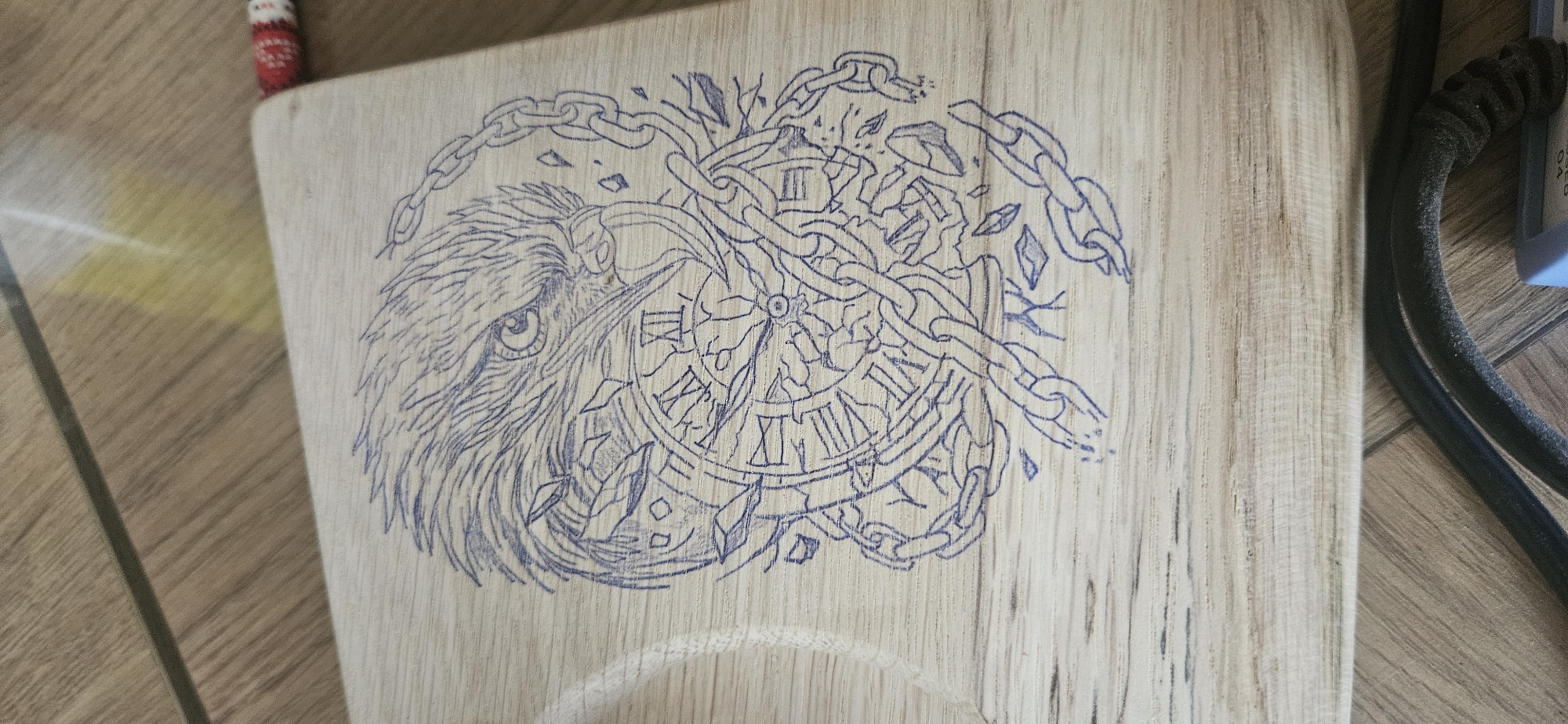 close-up of a wooden surface with an etched design. The design features a stylized eagle's head, an antique clock face with Roman numerals, and a broken chain. The clock face appears to be partially obscured by foliage or debris. The etching is in blue ink or paint. The wooden surface appears to be part of a larger object, possibly a cutting board or decorative panel. The location is unknown, but it is not confirmed to be Kostenets, Bulgaria.