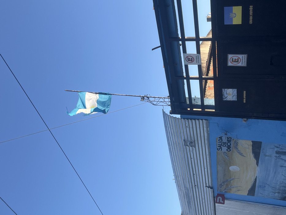 An outdoor daytime scene depicts a street-level view in Partido de Quilmes, Argentina, under a clear blue sky. A tattered Argentine flag, predominantly blue and white with a yellow sun emblem, flies from a metal pole atop a rudimentary metal structure positioned above a dark, likely metal, gate. Two dark utility lines traverse the upper left quadrant of the sky. To the left of the gate, a section of a corrugated metal wall or roof, silvery-grey and irregularly shaped at its top edge, is visible. Below this, a vibrant blue painted wall features a mural depicting a nocturnal or twilight landscape with water, land, and a large circular moon or sun. White text "SALIDA DE OCHES" is painted above the mural, and a red "P" parking sign is affixed to the blue wall to the left of the text. A small, light-colored object resembling a stylized face is mounted on the corrugated metal above the blue wall. The dark metal gate, spanning the center-right of the frame, is composed of vertical and horizontal bars. Two white "PROHIBIDO ESTACIONAR" (No Parking) signs, featuring a red circle with a diagonal line over a black 'E', are affixed to the gate at different heights. On the lower right panel of the gate, a small Ukrainian flag sticker is visible. Another square graphic, light-colored and abstract, is present on the lower left panel of the gate. Portions of other structures, including a reddish-brown brick wall and a dark roof, are discernible through the gate's openings in the background. No individuals are present.