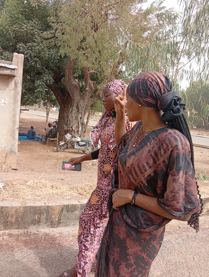 Two women are walking outside. The woman in the foreground is facing right, wearing a brown and black patterned head wrap and dress. She has a braid down her back. The other woman is behind her, wearing a pink and orange patterned head wrap and dress. She is holding a black smartphone in her hand and pointing her finger upward. In the background is a tree, a motorcycle, and two men sitting on the ground. There is a building to the left and a road to the right.