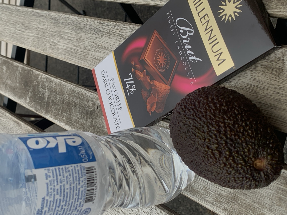 A static, eye-level shot depicts three food items arranged on a weathered, light brown wooden slatted surface. On the left, a clear plastic bottle of "eiko" (or "ekko") mineral water, with a volume of 0.5 liters, stands upright. Its blue and white label prominently displays Cyrillic text, including the manufacturing address: "м. Київ, вул. Калашніка, 21-32-44-3-MHO", indicating Kalashnika Street in Kyiv, Ukraine. To the right of the water bottle, a dark brown, textured, unpeeled avocado rests horizontally on the wooden surface. Further to the right and slightly behind the avocado, a rectangular chocolate bar package is positioned diagonally. The package is predominantly dark gray/black with gold and red details, displaying the brand name "MILLENNIUM Brut" and specifying "FAVORITE DARK CHOCOLATE 74%". No individuals or active interactions are visible in the scene. The wooden surface shows wear and horizontal striations, with darker, blurred areas visible through the gaps between the slats.