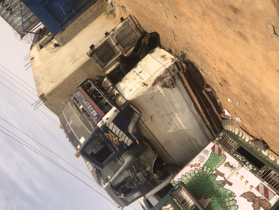 The scene depicts a cluttered outdoor area in Tukur Tukur, Nigeria, featuring multiple derelict commercial vehicles on an unpaved, reddish-brown dirt ground
