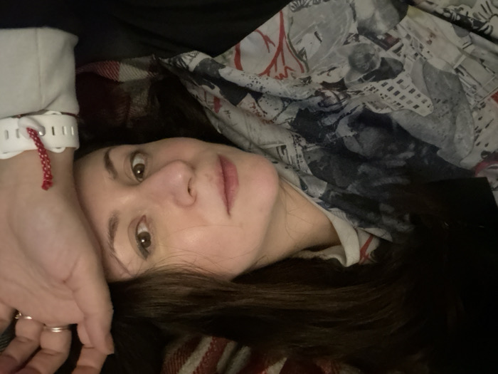 A female subject is depicted lying supine in an indoor setting. Her head is slightly tilted, with long, dark brown hair spread against a dark red and cream plaid blanket. She wears a light-colored garment beneath a patterned textile, which features shades of grey, white, red, and black in abstract or architectural designs, partially covering her torso. Her brown eyes are open, directed towards the viewer, and her lips show a faint color. Her left arm is positioned alongside her head. On her left wrist is a white, ridged wristband, from which a red braided cord or bracelet extends. Multiple rings are visible on the fingers of her left hand. The background above her head is dark and indistinct. The scene is located in Macclesfield, United Kingdom.
