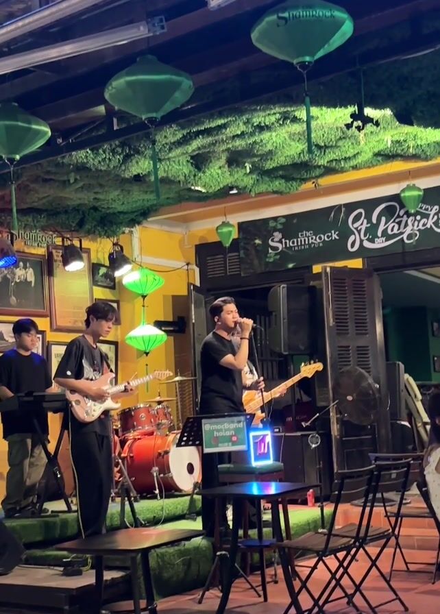 Here’s a detailed description of the video: The video shows a live band performing on an outdoor stage in front of a bar. The band consists of four members: a keyboardist on the left, a guitarist to his right, a lead vocalist in the center, and a bass guitarist to his right as well as a drummer behind them. The vocalist stands in front of a microphone on a stand, with a music stand next to it. The band is performing on a small stage covered in artificial turf. The background shows an Irish pub called "The Shamrock," with decorations including green lanterns and artificial foliage hanging from the ceiling. There are tables and chairs set up in front of the stage. The pub's sign mentions "St. Patrick's Day." The lighting is warm.