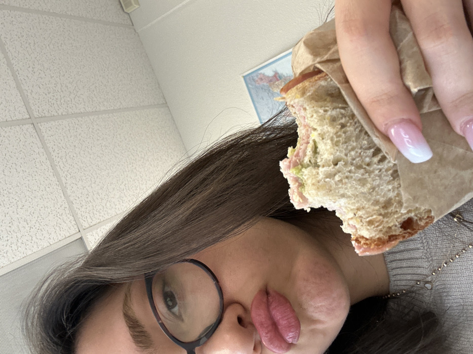 The image displays a close-up selfie of an individual in an indoor environment located in Las Vegas, United States. The subject, a person with long, dark brown hair, wears black-rimmed glasses and a light grey knitted top. Their lips are pursed in a "duck face" expression, prominent and glossy. The individual holds a partially eaten sandwich, wrapped in brown paper, in their left hand. The sandwich appears to be on whole wheat bread with visible pink deli meat and green fillings. The subject's left hand features long, manicured nails with a pink-to-white ombré French tip design. A delicate silver-toned necklace with small beads and a heart-shaped pendant is visible. The background shows a white acoustic drop ceiling and a plain light-colored wall, with a partially visible map or poster, predominantly blue and red, affixed to the wall on the right side of the frame.
