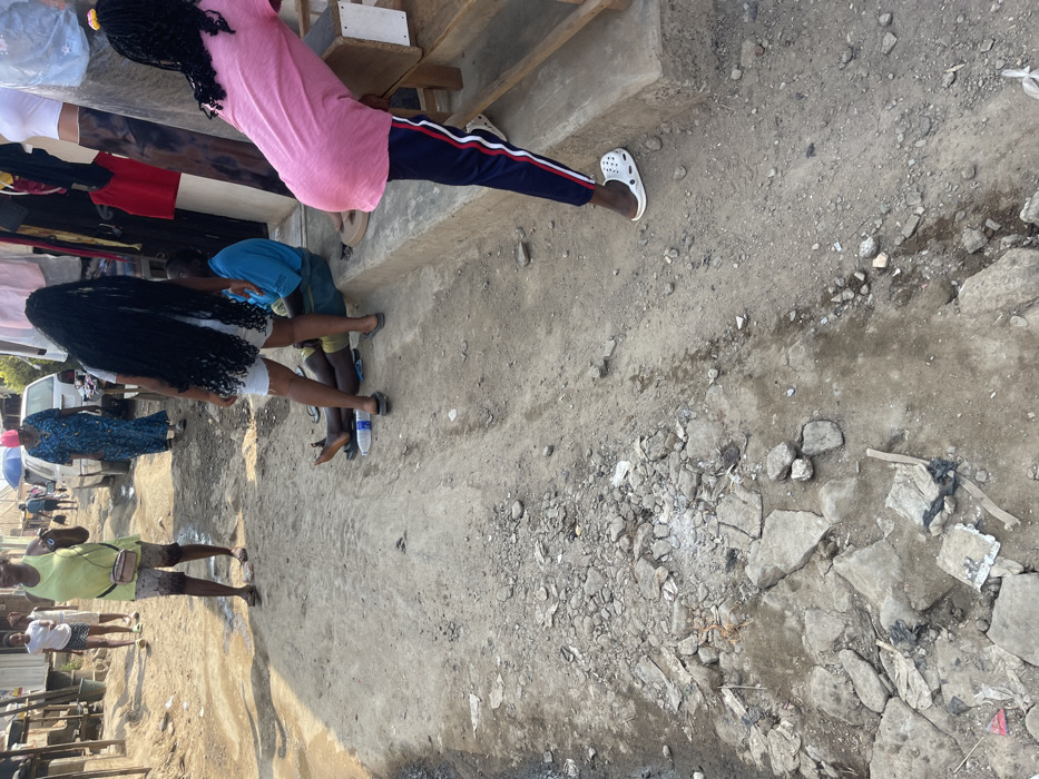 The image depicts a daytime street scene in Lugbe, Nigeria. The foreground and mid-ground are dominated by an unpaved, uneven dirt road strewn with rocks, debris, and broken concrete. On the right side, a raised concrete ledge or sidewalk runs parallel to the road. Several individuals are present. In the immediate foreground on the right, a person with their back to the camera wears a pink t-shirt, blue track pants with red and white stripes, and a white Croc on their visible foot, leaning over a light-colored wooden structure. To their left, a person with very long, dark braided hair, wearing a light-colored top and shorts with dark flip-flops, stands over a seated individual. The seated person, wearing a blue shirt and light-colored shorts, rests against the concrete ledge. A clear plastic water bottle lies on the ground near their feet. Further back on the left side of the road, a woman in a lime green top, light shorts, and flip-flops walks towards the camera, carrying a light-colored shoulder bag. Behind her, two other individuals walk away from the camera; one wears a white t-shirt and shorts. In the deeper background, a woman in a blue patterned dress and a pink head covering walks near a parked white vehicle. Buildings with corrugated metal roofs line the left side of the road. On the right, various items of clothing are displayed on a rack or line near the wooden structure. The scene is illuminated by direct sunlight, indicating an outdoor setting during the day.
