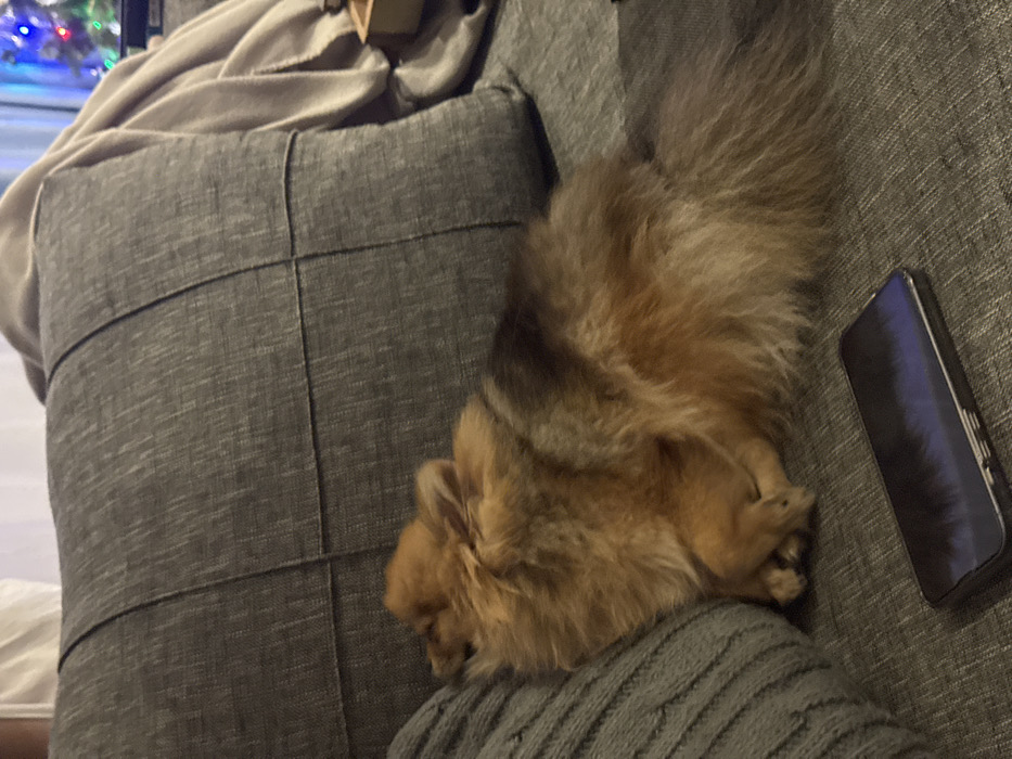 A fluffy, golden-brown Pomeranian dog rests on a gray couch, its head nestled on a knitted gray blanket. The dog's tail extends towards a black smartphone lying on the couch. A textured gray pillow is positioned behind the dog, and a soft, beige throw is draped over the pillow. A blurred Christmas tree with colorful lights is visible in the background.