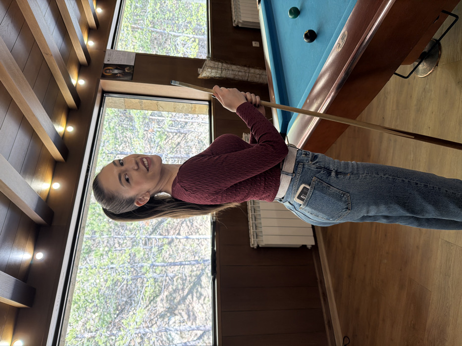 An indoor recreation area in Kladnitsa, Bulgaria, features a young adult female standing beside a pool table. The room has a wooden floor, dark brown wood paneling on the lower walls, and extensive windows revealing a wooded exterior. The ceiling comprises exposed wooden beams with recessed lighting. A white radiator is visible beneath the left window, and a framed image of an elderly bearded man hangs on the wall near the right window. The female subject, with long brown hair in a high ponytail, wears a textured maroon long-sleeved top, blue jeans, and a light-colored belt. A smartphone with a dark case is visible in her right rear jean pocket. She holds a wooden pool cue vertically with both hands and is smiling directly towards the camera. On the light blue felt surface of the pool table, two billiard balls, one black and one green, are present.