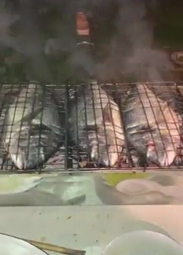 Three whole fish are grilling over hot coals, emitting a cloud of smoke
