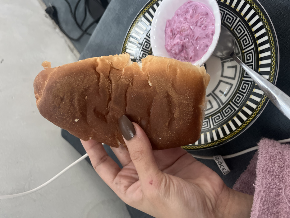 An indoor scene in Nuseirat, Palestinian Territory, captured from a first-person perspective, depicts a human hand holding a bread roll over a patterned plate containing a small bowl of pink dip. In the foreground, a left hand with dark brown painted fingernails grips an elongated, golden-brown bread roll, which appears partially torn. A small reddish mark is visible on the back of the hand, near the base of the index finger. Below the hand, a fuzzy, light pink fabric is visible, likely a towel or blanket. A white charging cable runs across the lower left. Centered in the middle ground, a round plate with a black and white Greek key pattern and a gold border holds a small, white, fluted ceramic bowl. The bowl contains a creamy, pinkish-purple mixture with visible textured elements, resembling a salad or dip. A silver-colored spoon rests on the plate next to the bowl. The background shows a light-colored wall with some subtle texture. To the right, a dark blue or grey fabric, possibly clothing, is visible. An black electrical cord and a dark plug are also partially visible against the wall in the upper right quadrant of the image.